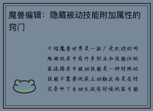 魔兽编辑:隐藏被动技能附加属性的窍门