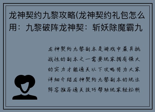 龙神契约九黎攻略(龙神契约礼包怎么用:九黎破阵龙神契:斩妖除魔霸九州)